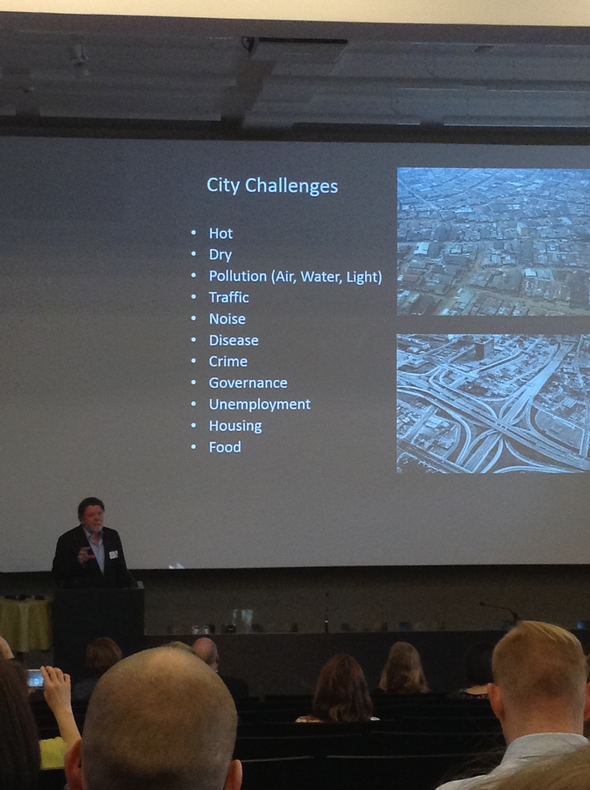 Gary Grantin (johtaja, Green Infrastructure consultancy, London, UK) esitys oli todella kiinnostava. Hän kertoi kaupunkien haasteista sopeutumisessa sään ääri-ilmiöihin kuten kuumuuteen. Viherkatot voisivat laskea lämpötilaa taloissa niissä kaupungeissa, jotka kärsivät kuumuusaalloista. Päinvastoin kuin usein luullaan, viherkatot ja aurinkopaneelit ovat yhdistettävissä ja hyönteisetkin viihtyvät viherkatoilla. Sade nähdään usein ongelmana, mutta asennetta muuttamalla ja suunnittelemalla luonnonmukaisempia ympäristöjä voisimme esimerkiksi vähentää viemäriin menevän veden määrää.
